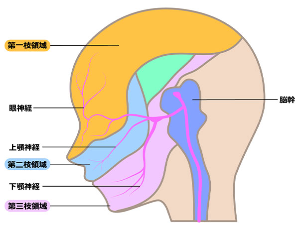 三叉神経とは、顔の感覚を脳に伝える役割を担う末梢神経です。顔周辺の皮膚にくまなく分布し、触覚・痛覚・温度覚などの感覚情報のセンサーとしての機能を担っています。大きく分類すると、三方向(三叉)に分かれており、目から上のおでこ周辺、目と口の間のほっぺ周辺、口から下の顎周辺の3つの領域に分布しています。3本の枝は脳に入る手前で1本にまとまり、脳幹というところで中枢神経に入ります。そして大脳に接続され、痛い・熱い・気持ちよいなどの感覚として感じられます。